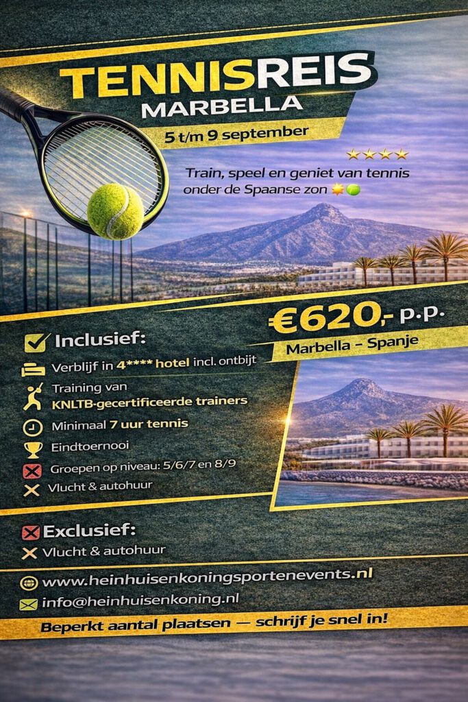 Beleef een unieke tenniservaring aan de Costa del Sol. Tijdens deze exclusieve tennisreis combineer je intensieve trainingen, wedstrijden en ontspanning met een verblijf in een comfortabel 4-sterrenhotel inclusief ontbijt. Geschikt voor fanatieke recreanten en competitieve spelers die hun spel naar een hoger niveau willen tillen.